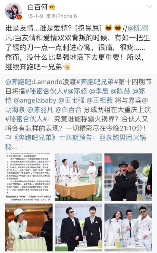 2015年1月,白百何发了一条跟陈羽凡一起参加跑男的微博,还话里话外地吃了一会儿羽泉的醋。