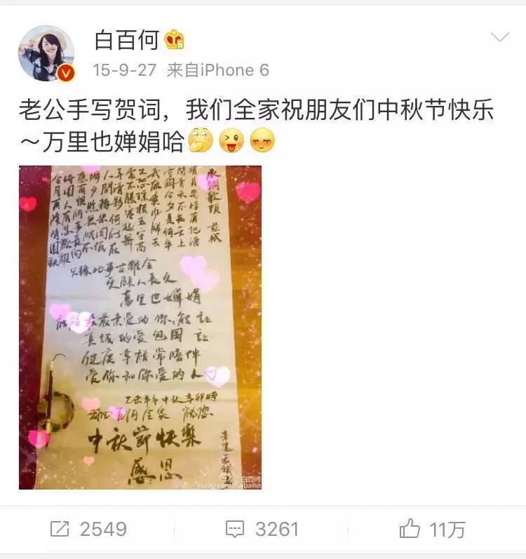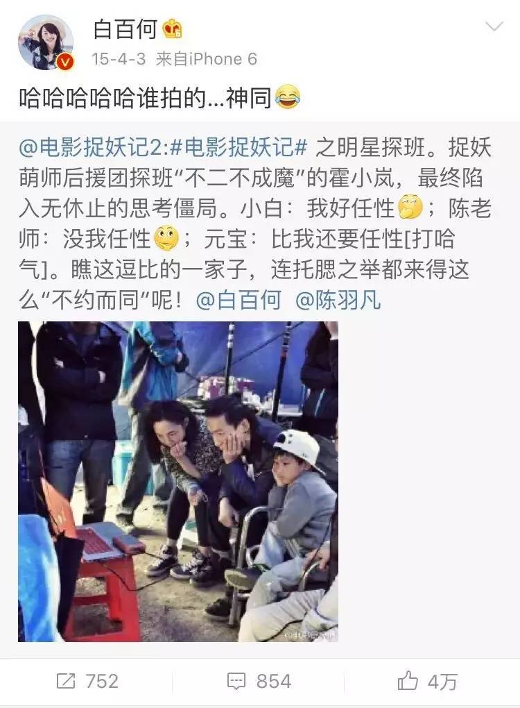这一年,她在微博上关于的老公呼唤就又回归了;她发《捉妖记》拍摄时,陈羽凡去探班,一家人的和谐场景;她抱怨老公的青岛话不标准;晒中秋节老公的手写贺词。