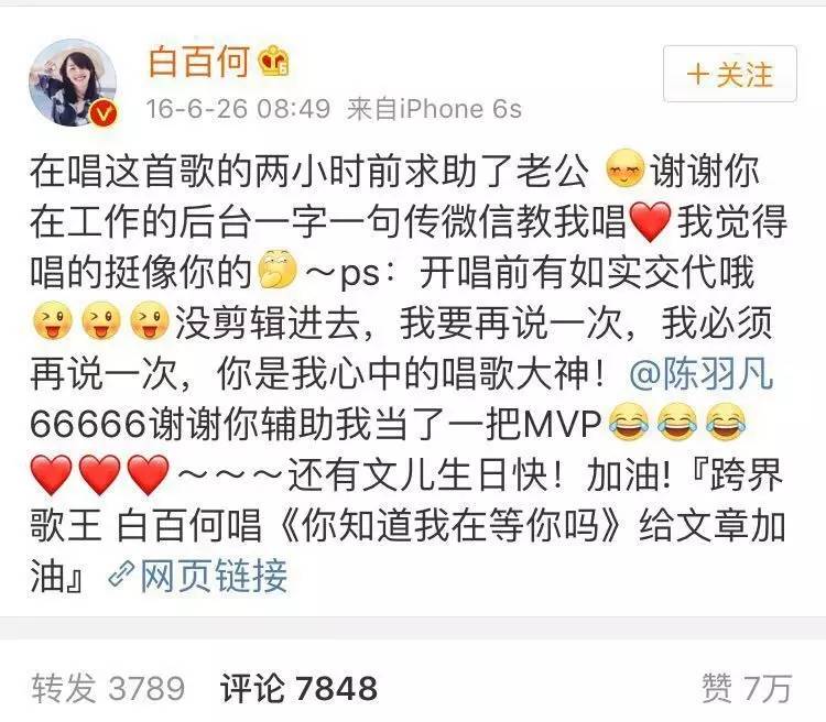 2016年的跨界歌王,白百何唱的不错,但如果少了她微博里这句“老公一字一句传唱”的加持,换成她对着泳池一边喂食十八线男模,一边练习海豚音,你还真地有那么多的好感吗?