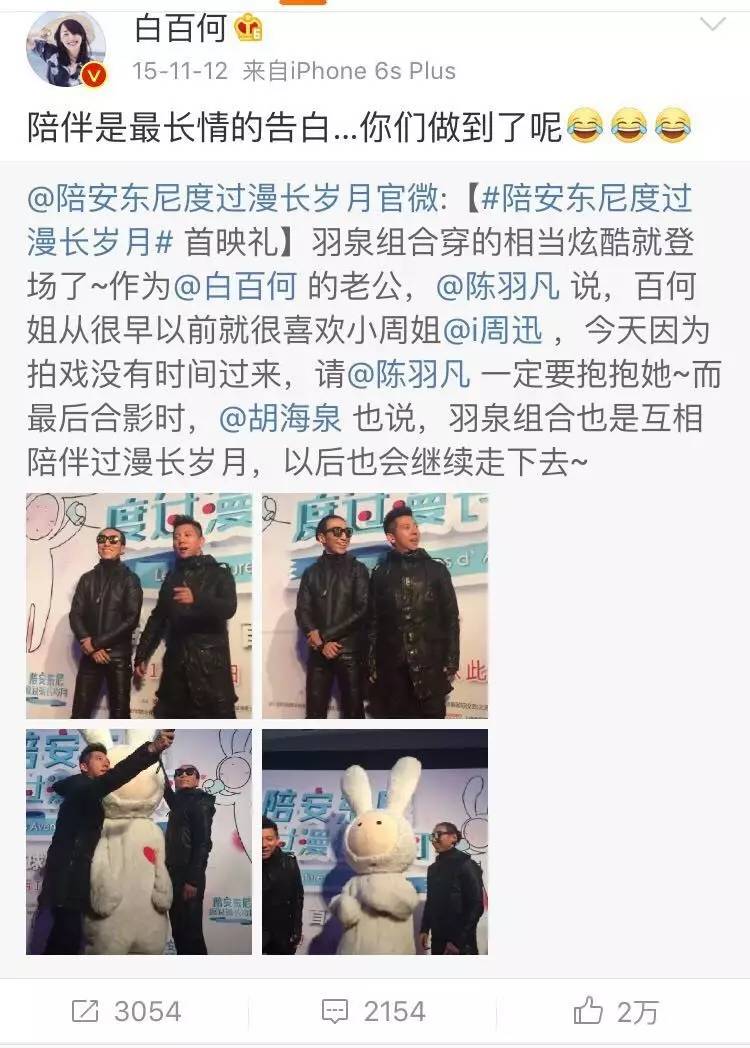 2015年11月,《陪安东尼度过漫长岁月》首映礼上,羽泉组合现身,白百何又小醋意地调侃一番。