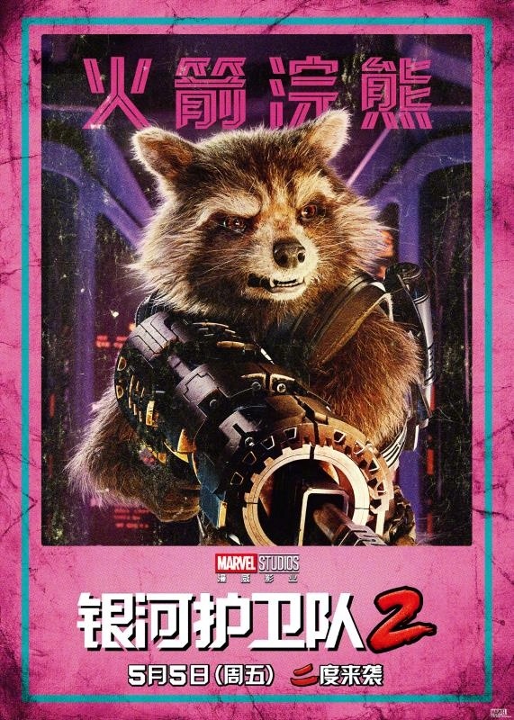 火箭浣熊由布莱德利·库珀配音,是格鲁特合伙的宇宙强盗,与格鲁特同为银河系的赏金猎人。