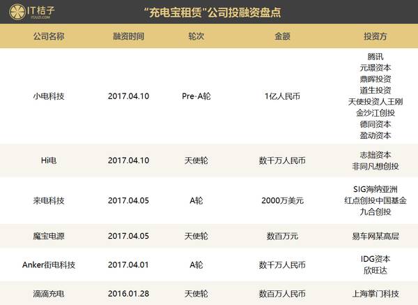 3月31日,小电宣布获得数千万元天使投资,由金沙江创投、王刚领投,德同资本、招银国际、盈动资本跟投;同日,街电获得了IDG资本、欣旺达领投,联新资本等跟投的A轮融资;4月5日,来电科技获得2000万美金融资,SIG和红点中国领投,九合创投、飞毛腿跟投;近期共享充电宝获得融资的还有:Hi电、来电科技、街电等。