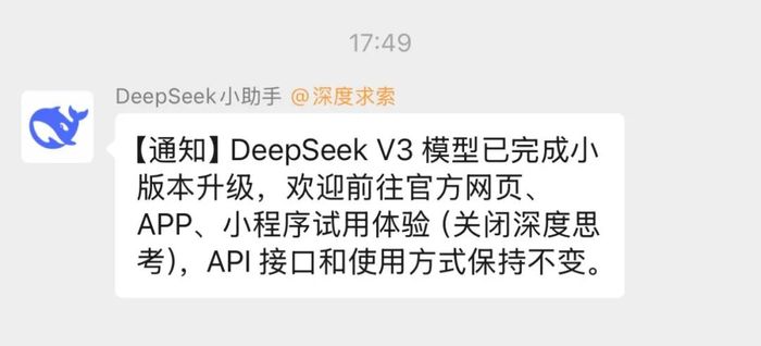 24日夜间,DeepSeek在用户群发出【通知】:DeepSeek V3 模型已完成小版本升级,欢迎前往官方网页、APP、小程序试用体验(关闭深度思考),API 接口和使用方式保持不变。
