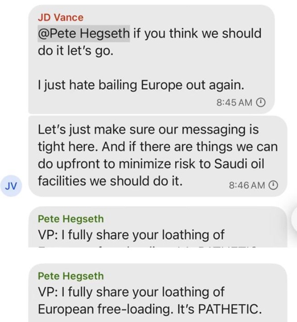 戈德伯格一直怀疑自己被设局诈骗,直到群中讨论的胡塞武装目标被击中后,才确信自己是被拉入了机密战争计划群。文章不仅批评了美国高层的“乌龙式”泄密操作,还披露了美国副总统詹姆斯·万斯、国防部长皮特·赫格塞斯、白宫副幕僚长斯蒂芬·米勒对欧洲盟友的鄙视和不满。