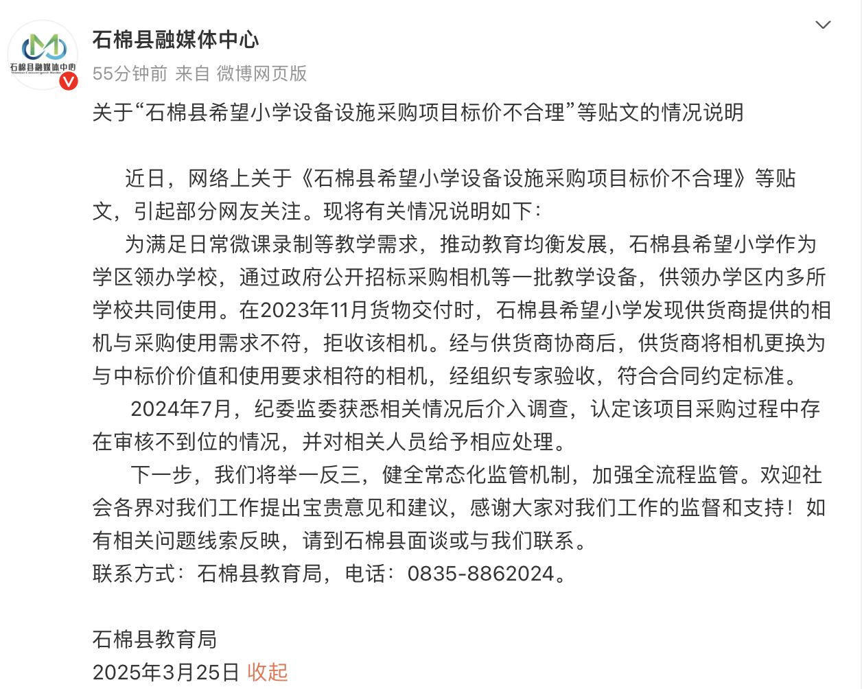 近日,有网民发消息称,在2023年的一份《四川省石棉县希望小学灾后恢复项目设备设施采购及安装中标(成交)结果公告》中,四川省石棉县希望小学采购的“松典相机”中标价格14050元,而该相机网络售价仅631元,质疑其中标价格不合理。对此,四川省石棉县教育局3月25日发布《关于“石棉县希望小学设备设施采购项目标价不合理”等贴文的情况说明》称,为满足日常微课录制等教学需求,推动教育均衡发展,石棉县希望小学作为学区领办学校,通过政府公开招标采购相机等一批教学设备,供领办学区内多所学校共同使用。在2023年11月货物交付时,石棉县希望小学发现供货商提供的相机与采购使用需求不符,拒收该相机。经与供货商协商后,供货商将相机更换为与中标价价值和使用要求相符的相机,经组织专家验收,符合合同约定标准。