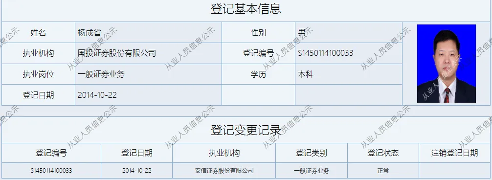 杨成省自2014年10月以来一直在国投证券,任职时间超过10年,财务出身,离职前担任的是财务总监一职。杨成省还曾先后担任空军某部连长、参谋,国家开发投资公司审计室业务主管等。和刘纯亮一样,也曾在安信证券资产管理任职过,担任的是副总经理。