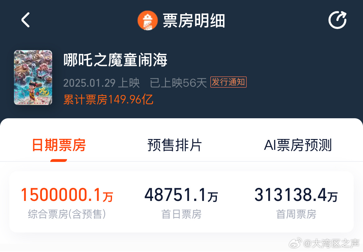 据网络平台数据,截至3月25日20时16分,《哪吒之魔童闹海》内地综合票房(含预售)突破150亿人民币,成为全球首部在单一市场票房超过150亿的影片。(大湾区之声)
