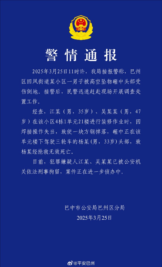 巴中市公安局巴州区分局发布警情通报:2025年3月25日11时许,我局接报警称,巴州区回风街道某小区一男子被高空坠物砸中头部受伤倒地。接警后,民警迅速赶赴现场开展调查处置工作。