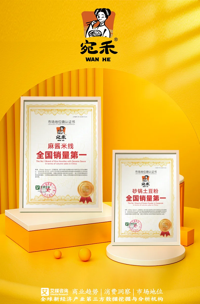 2025年3月,宛禾获全球新经济产业第三方数据挖掘和分析机构iiMedia Research(艾媒咨询)授予的“麻酱米线全国销量第一”“砂锅土豆粉全国销量第一”两项市场地位确认。