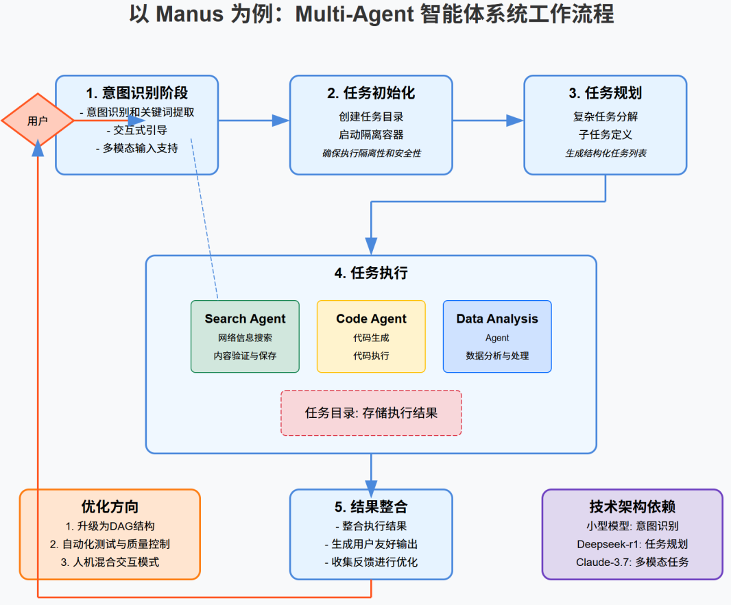 以Manus为例,其技术架构以多智能体协同为核心,采用分层结构与动态任务调度机制,通过规划智能体、执行智能体、验证智能体的协同,实现了从任务理解到成果交付的全流程自动化,大幅提升对复杂任务的处理效率。
