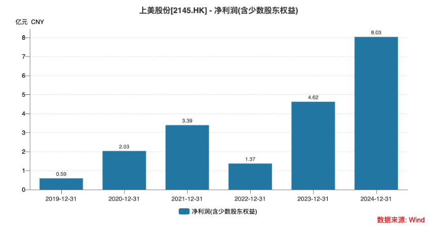 利润方面,上美股份在2024年度溢利为8.03亿元,同比增长74%,一年顶过去三年赚。