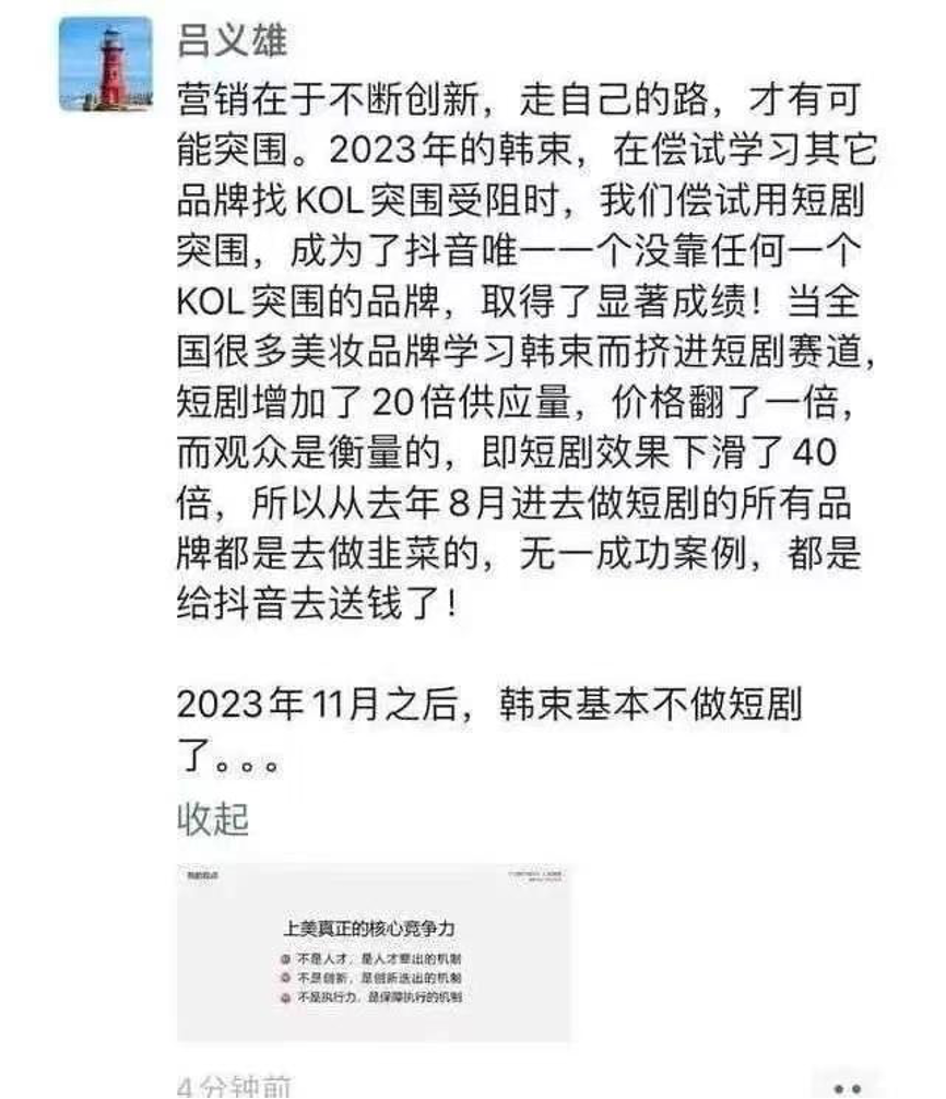 据多家媒体报道,上美集团创始人吕义雄曾公开表示,在2023年11月之后,韩束基本停止了剧本短剧的制作和投放,其表示短剧的供应量大幅增加,价格翻了一番,但营销效果却大幅下滑了40倍。