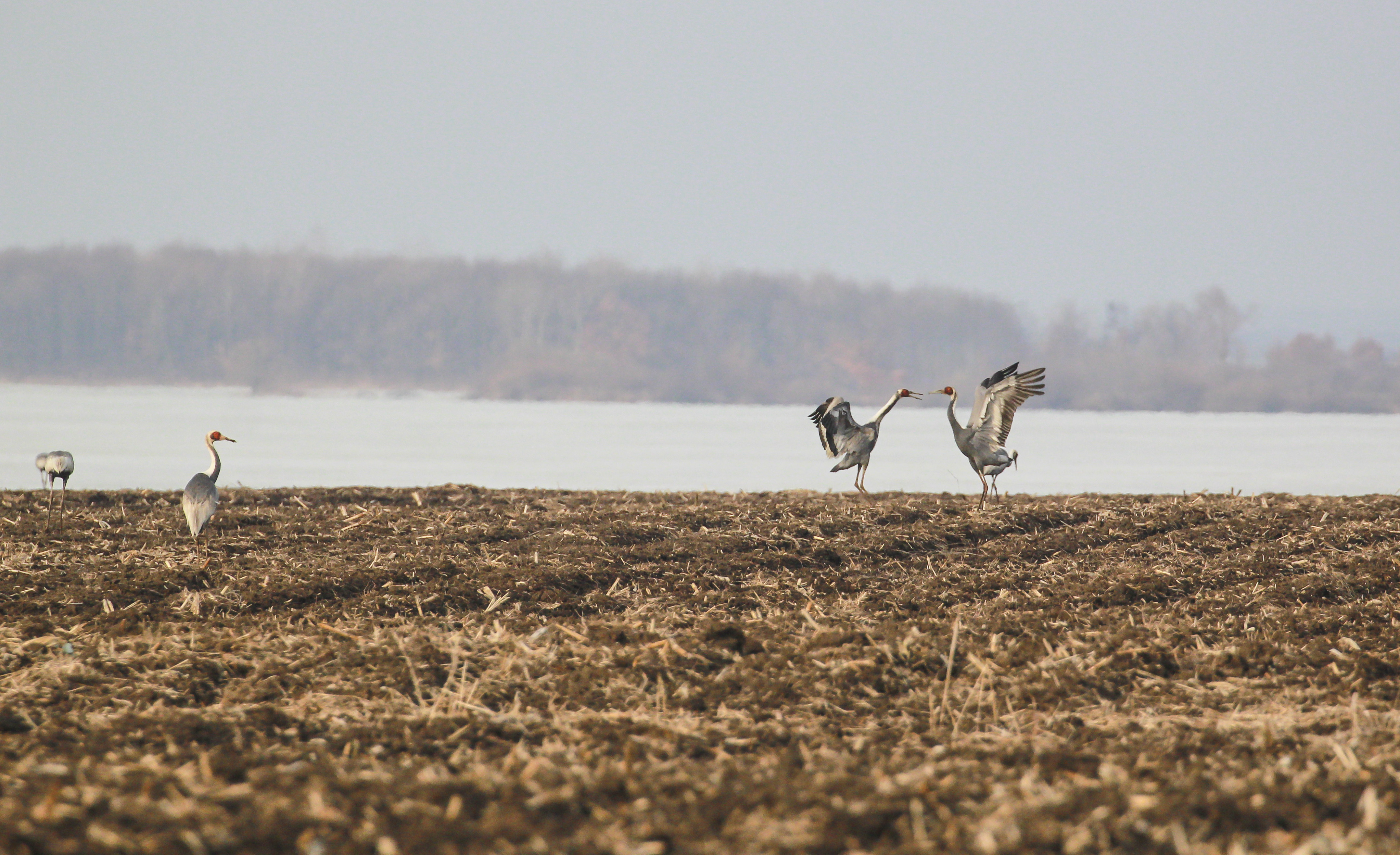 据了解,索伦农场和方山林场交界处拥有丰富的水资源,树林、田野和湿地交织,为候鸟提供了充足的食物。只见在田地里的白枕鹤或休闲觅食或嬉戏玩耍,时而觅食、时而飞翔、时而引吭高歌,十分惬意。