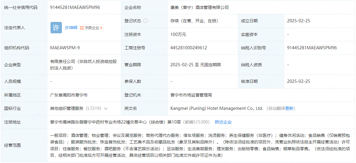 近日,此前因财务造假在A股市场引起轩然大波的康美药业(SH:600518)悄然“跨界”酒店业。根据企查查显示,康美(普宁)酒店管理有限公司于近日成立,控股股东为康美药业全资子公司康美(普宁)中药城商业管理有限公司,注册资本100万元。