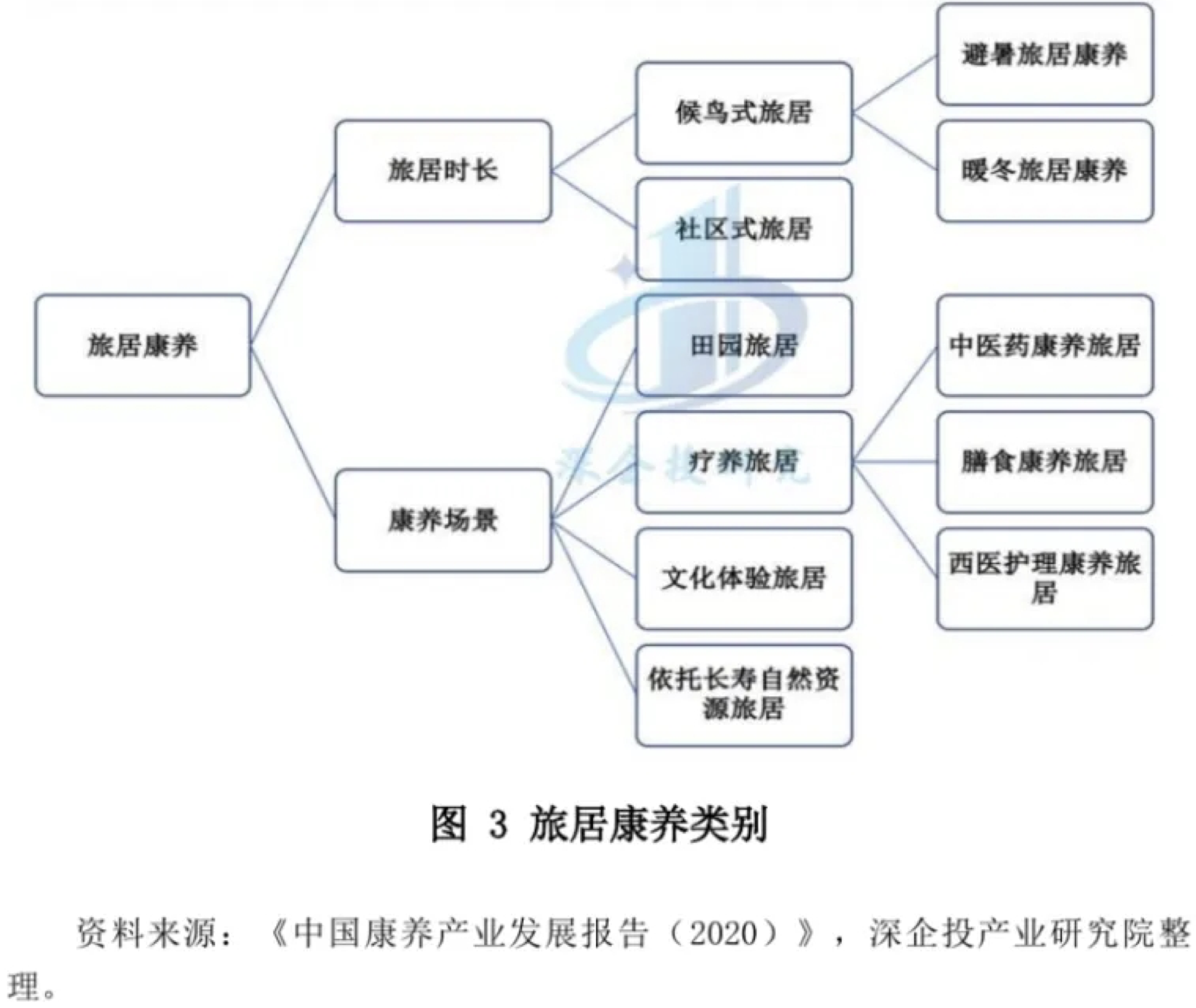 根据《中国康养产业发展报告(2020)》显示,基于康养场景可以将旅居康养分为田园旅居、疗养旅居、文化体验旅居、自然资源旅居四大类,其中疗养旅居又可以分为中医药康养旅居、膳食康养旅居、西医护理康养旅居。