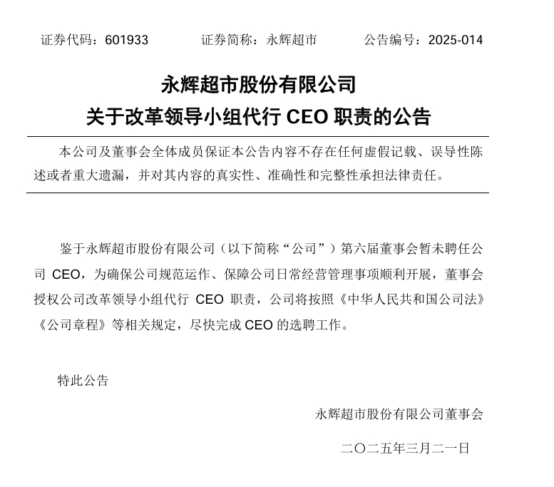 更引人注目的是,永辉宣布暂不聘任新CEO,而是成立由叶国富担任组长的“改革领导小组”,代行CEO职权。