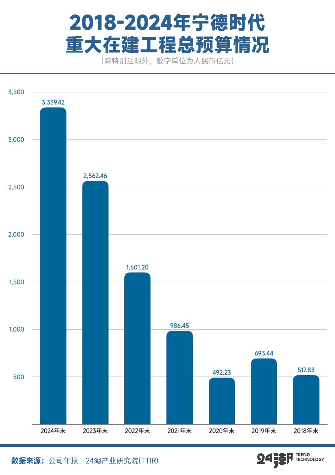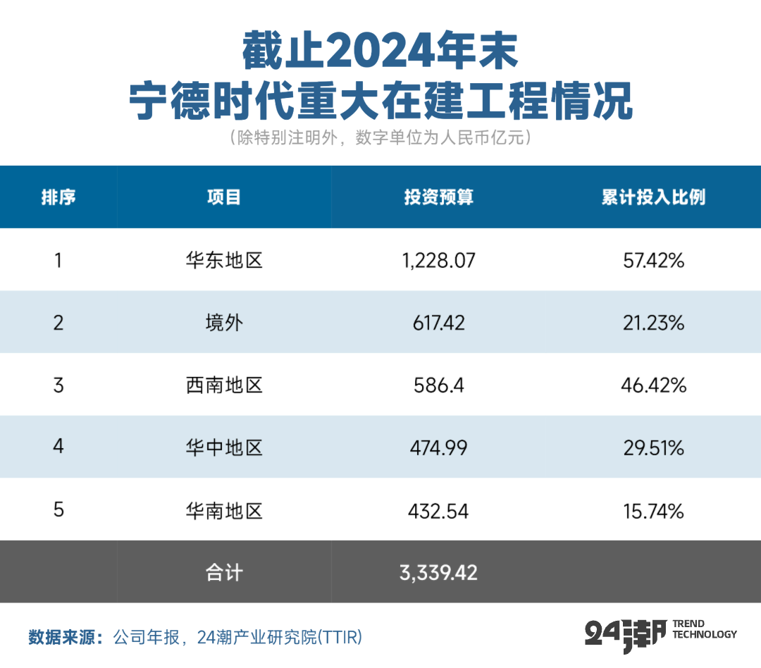 财报显示,截止2024年末,宁德时代在欧洲、华东、西南、华中和华南地区还有很多超级工程进入执行(施工)阶段,项目总投资预算达3339.42亿元,同比增长了30.32%,投资规模连续4年刷新历史最高记录。