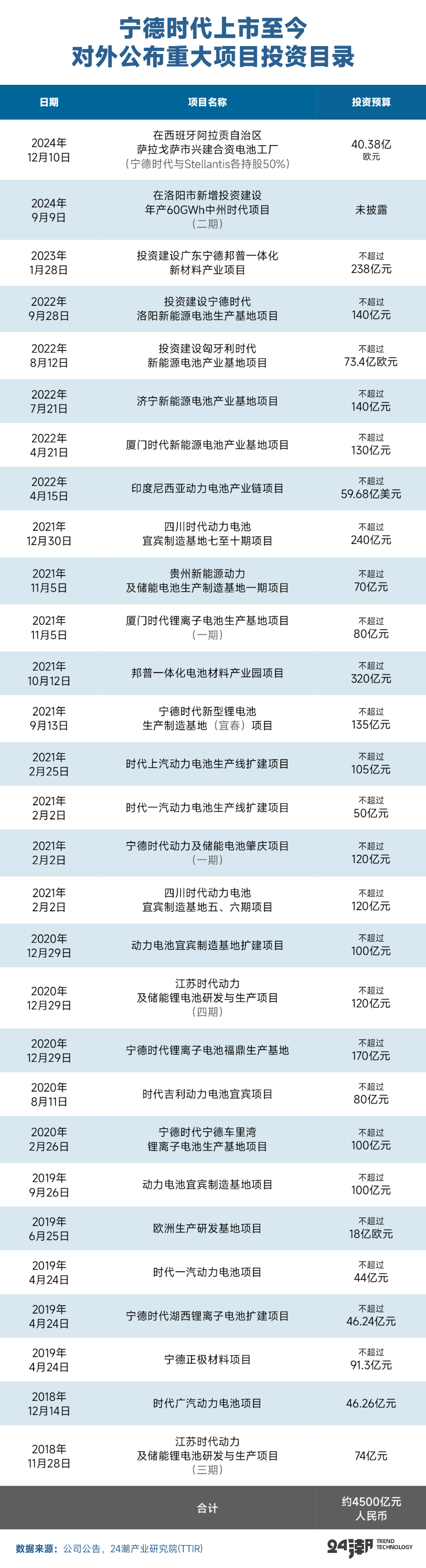 据24潮产业研究院(TTIR)统计,2018年至今(25年3月),宁德时代约发布了29个重大投资项目公告,项目总投资预算近4500亿元,其中单个投资预算在100以上的项目多达21个,投资领域主要覆盖动力电池、储能电池、正负极材料及锂电池回收一体化项目、海外研发基地等,其投资频率之快,规模之凶猛,业内根本没有匹敌者。