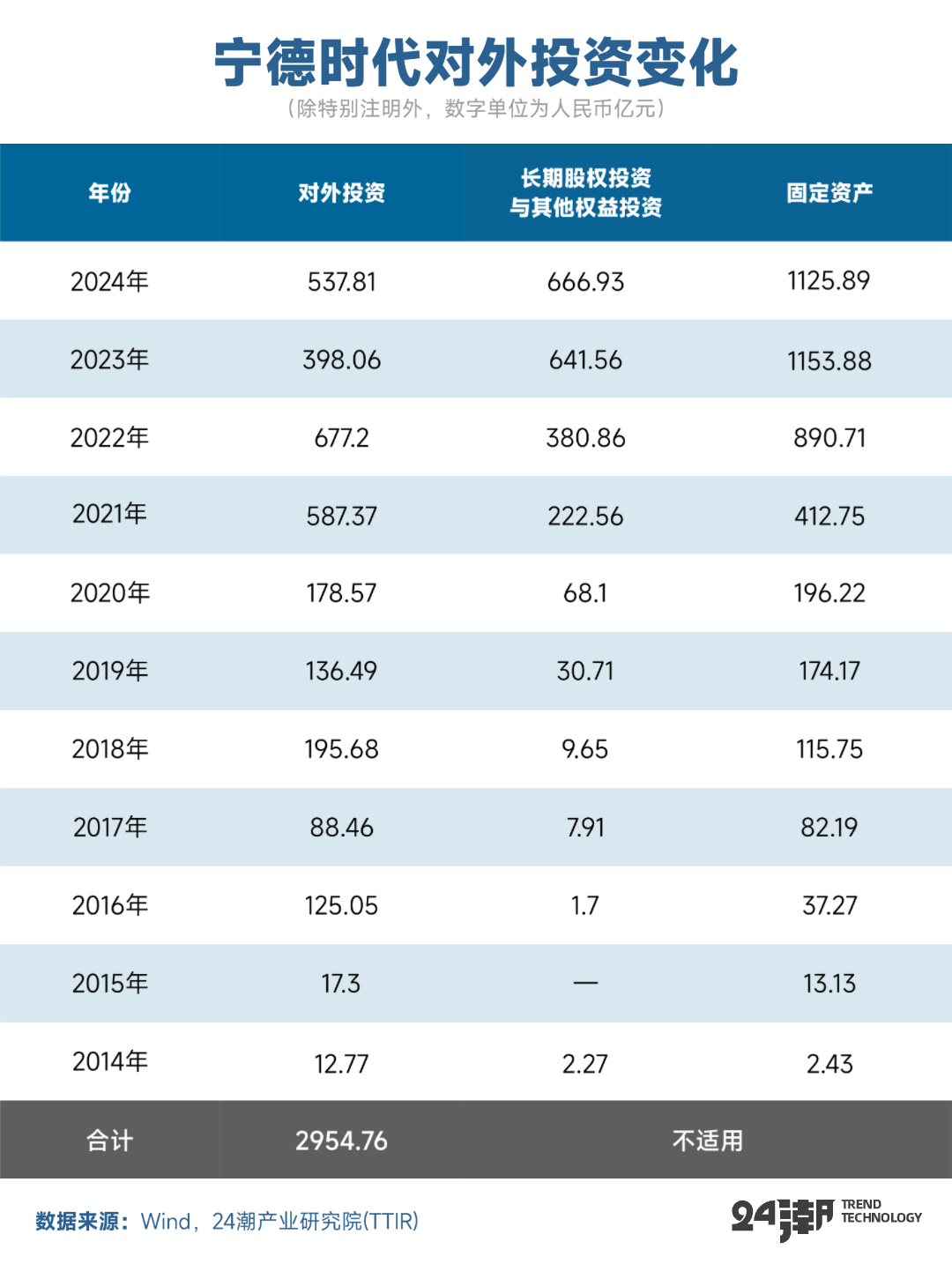 历史证明,宁德时代绝非纸上谈兵之辈,其已经展现了强悍的战略执行力。据24潮统计,过去11年间(2014年-2024年),宁德时代累计对外投资(现金流)达2954.76亿元,从数据变化看,2021年以来宁德时代扩张有明显加速趋势,2021-2024年四年间期对外投资合计高达2200.44亿元,占过去11年总投资的比例为74.47%。
