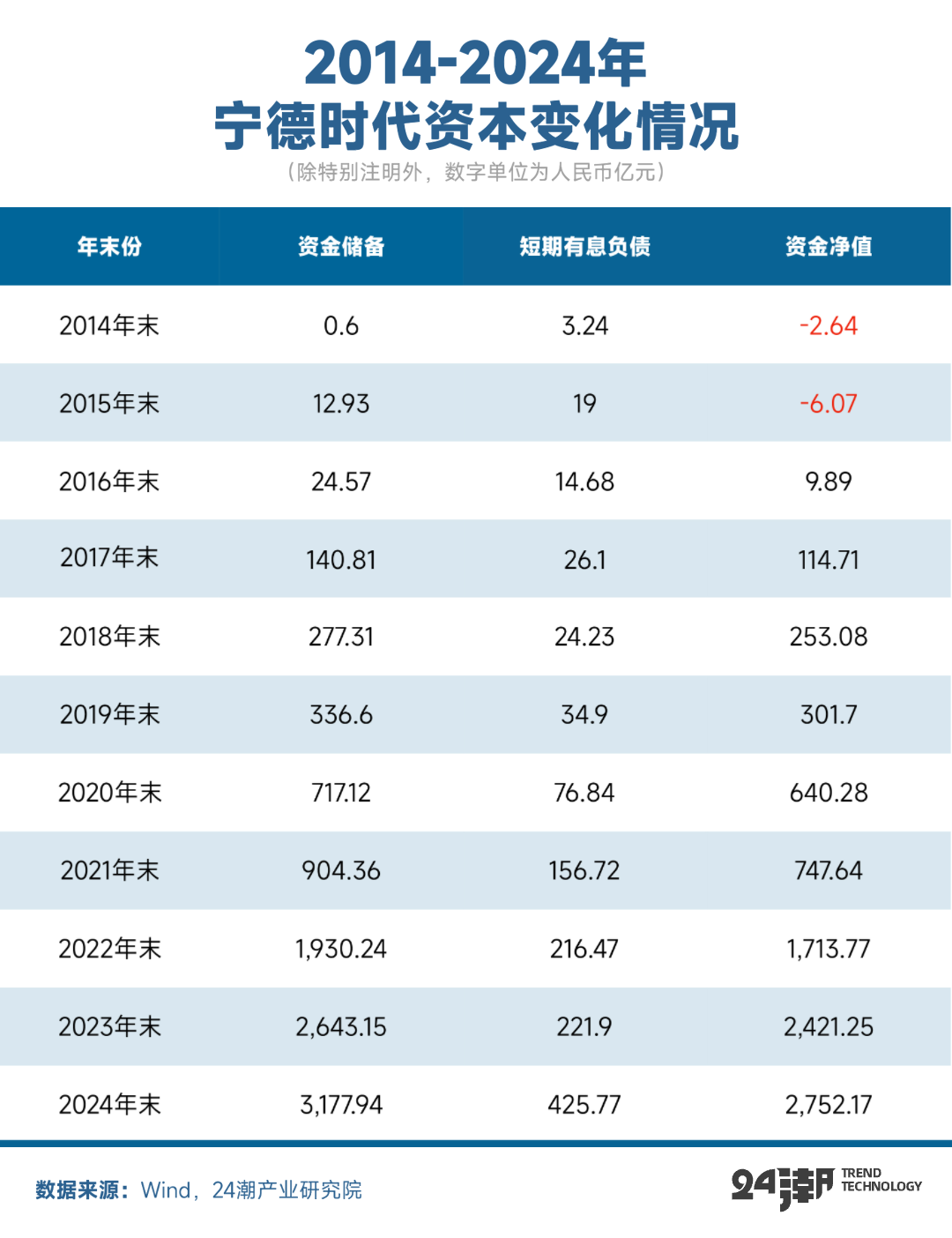 另一方面,笔者分析认为,不断提升的资本实力也在为宁德时代持续扩张的商业帝国提供强力支撑。据24潮产业研究院(TTIR)统计,截止24年末宁德时代资金储备已增至3177.94亿元,剔除短期有息负债后其资金净值达2752.17亿元,资本实力位居全行业第一。