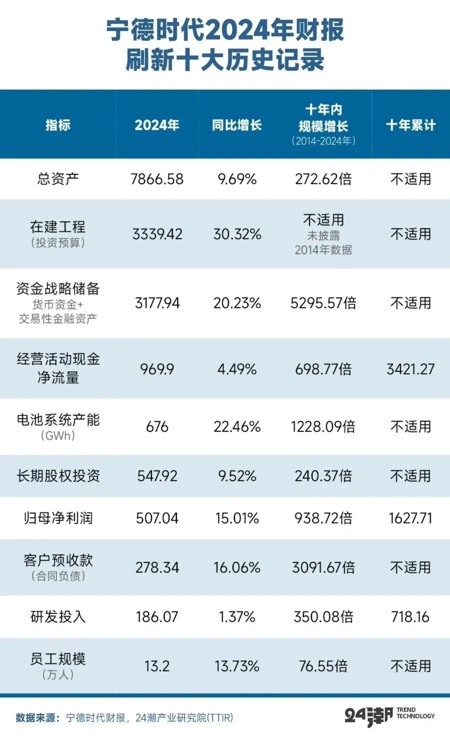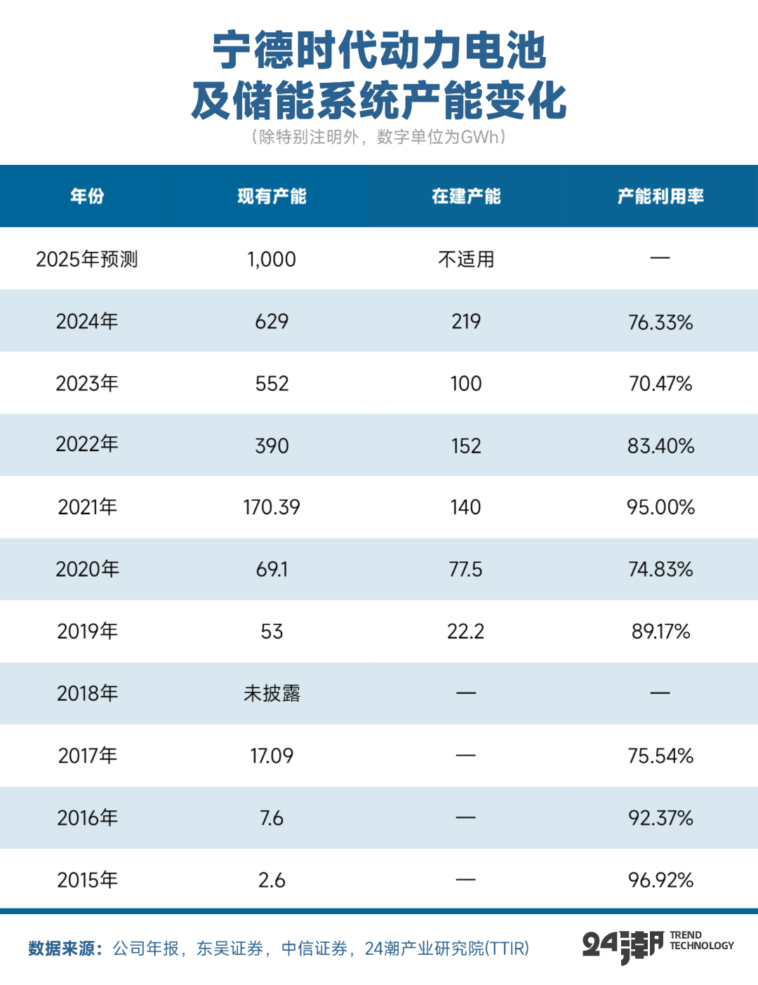 另据24潮产业研究院(TTIR)统计,过去10年间(2015年-2024年),宁德时代动力电池及储能系统产能增长了240.92倍,截止2024年末其产能规模达629GWh,在建产能达219GWh。