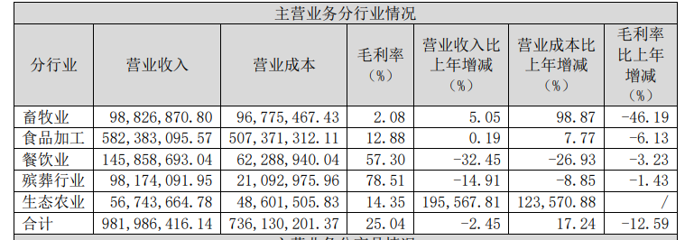具体到各个细分板块的营收情况来看,2024年,福成股份的畜牧业、食品加工、餐饮业、殡葬行业毛利率较2023年均处于下滑状态,其中畜牧业毛利率下降最为明显,从2023年的48.27%下降到去年的2.08%。