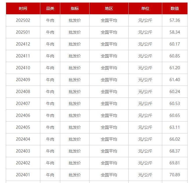 把时间线拉长来看,牛肉价格低位运行已经持续一年多了。据农业农村部监测,2024年,全国的牛肉批发均价一路下探,年初还超过70元/公斤,年底已经在60元/公斤徘徊。到今年2月,牛肉批发价则进一步下探至57.36元/公斤。1年多时间里,降幅已经超过2成。