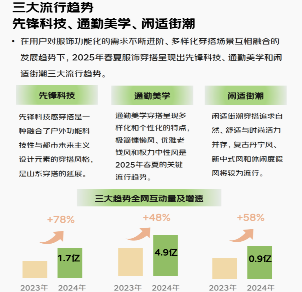 在京东发布的《2025京东服饰春夏趋势白皮书》中,把流行趋势总结成“科技感户外”“通勤高级风”这些关键词,可供品牌抄答案的同时,也让本就爱“实在货”的京东用户一目了然,把产品变成生活刚需,直接打明牌。