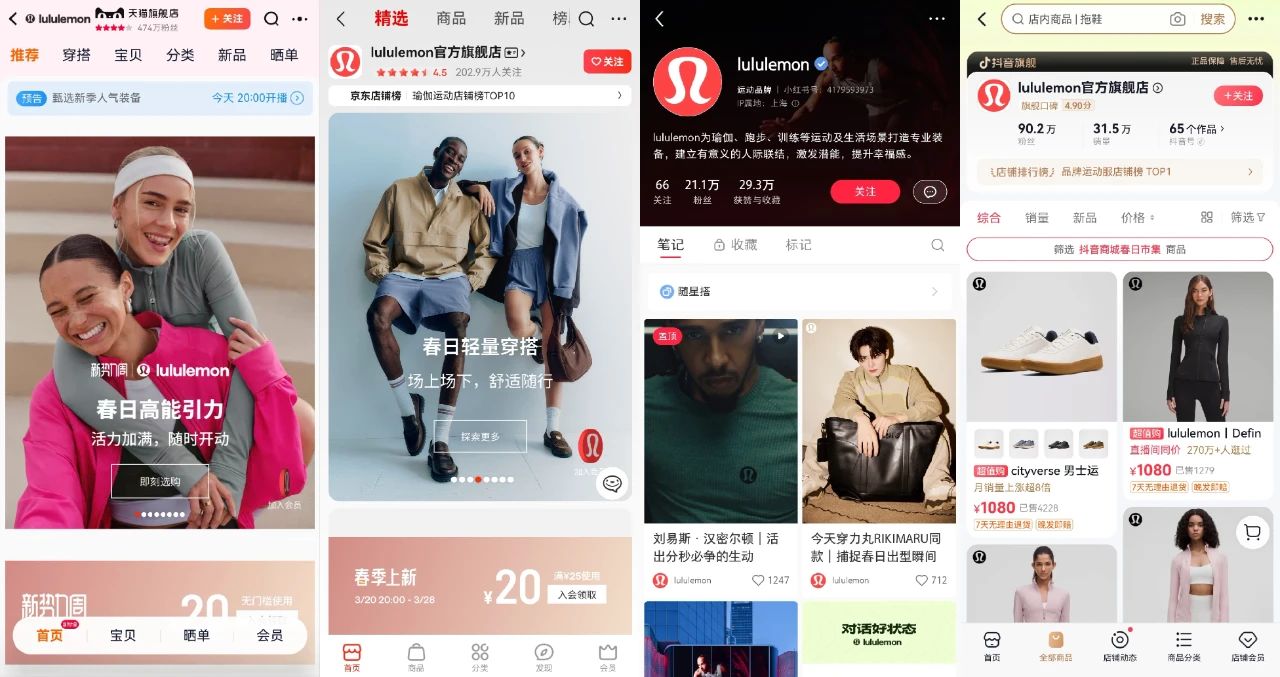 就比如近年来的中产新贵——lululemon,从2015年、2018年到2022年,lululemon陆续登陆天猫、小红书与京东,抖音是lululemon最晚入驻的平台,直至2024年才正式开设抖音旗舰店。这些电商平台也为lululemon带来了新客流,增长黑盒数据显示,电商对lululemon增量的贡献,从2011年的17%增至2022年的50%。在抖音渠道,据果集数据,截至2024年12月17日,lululemon抖音总销售额达到6.17亿。