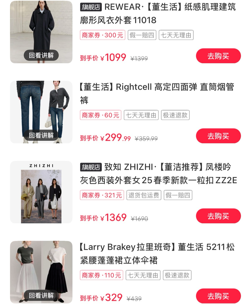 例如,在董洁3月14日开春上新的直播中,多了一些价位两三百元的单品,相比以往千元服饰扎堆的情况有所改变,部分网友表示“以前狠狠心也是买不下手,这次明显能感觉到整体客单价下调了”。