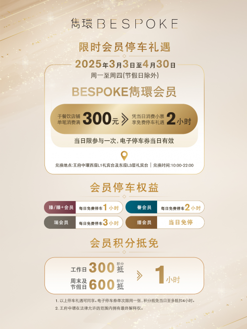 商场餐饮消费停车满减:4月30日前,每周一至周四(节假日除外)到场内餐饮店铺单笔消费满300元,即可凭当日消费小票享2小时免费停车礼遇。还有银联卡支付满减优惠等春日礼遇,一口春鲜,半日浮生,皆成紫禁城畔的饮食赋格。