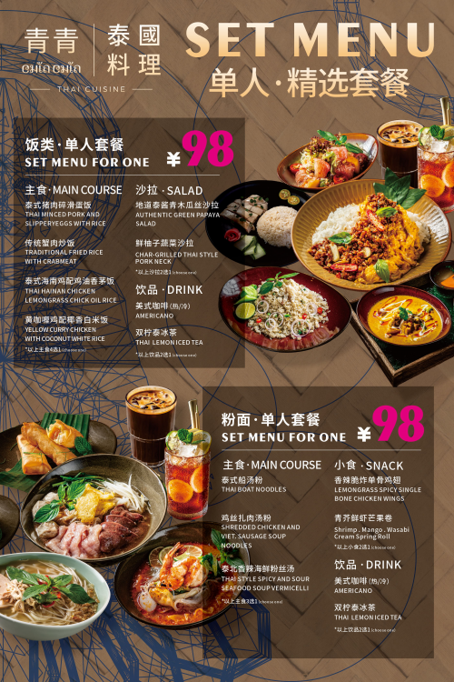 青青·泰国餐吧:饭类、粉面单人套餐。作为北京首店,让职场打工人在忙碌的工作日也能品尝到地道的泰国风味。