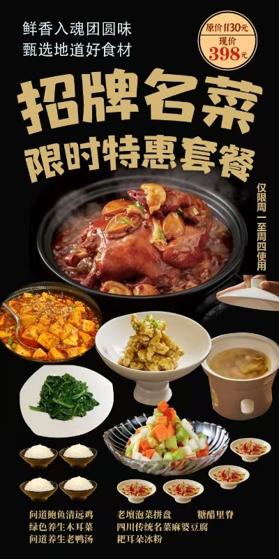 莆田餐厅:闽南风味双人诗篇。山林珍馐套餐:走地鸡与山珍共舞,慢火炖出山林精华,每一口都是《风味人间》即视感;闽海金鳞套餐:深海大黄鱼淋秘制酱汁,搭配地道闽南风味小食,鲜香与精致并存。