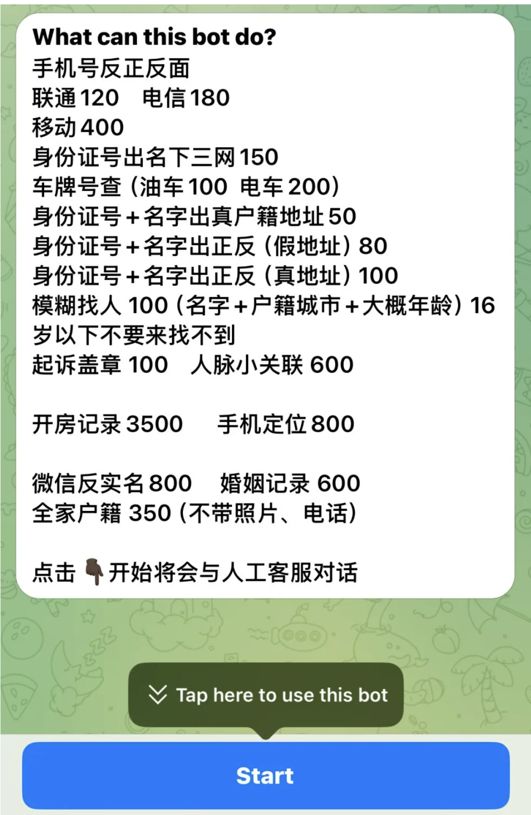 每个人视为“隐私”的身份证号码、电话号码、户籍信息,在这里不仅透明可查,而且这些信息像垃圾一样,在各个频道和群组里,随处刷屏。就像一个群友说的那样:“只要你钱到位,什么人都能开。”