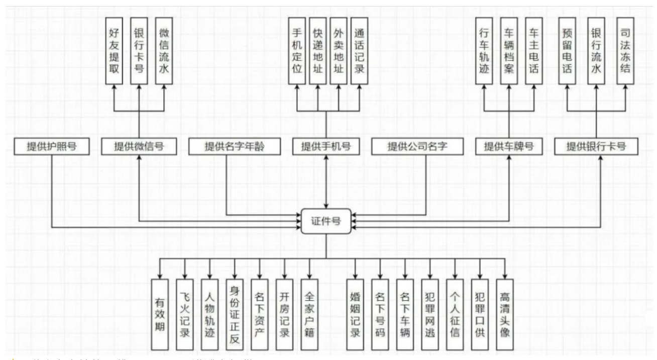在一张查档的思维导图中,通过一个证件号,可以查询20余项直接信息,也可以通过其中的微信号、手机号、车牌号、银行卡号反向查询证件号。通过微信号、车牌号、银行卡号还可以查询下一层级间接信息,比如微信流水、行车轨迹、银行流水。