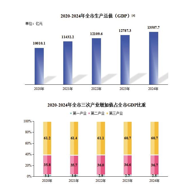 初步核算,全年生产总值(GDP)13507.69亿元,按不变价格计算,比上年增长6.1%。其中,第一产业增加值343.26亿元,增长3.0%;第二产业增加值4961.25亿元,增长8.4%;第三产业增加值8203.18亿元,增长4.8%。三次产业结构为2.5:36.7:60.7。按常住人口计算,人均GDP136063元(折合19105美元),比上年增长4.1%。