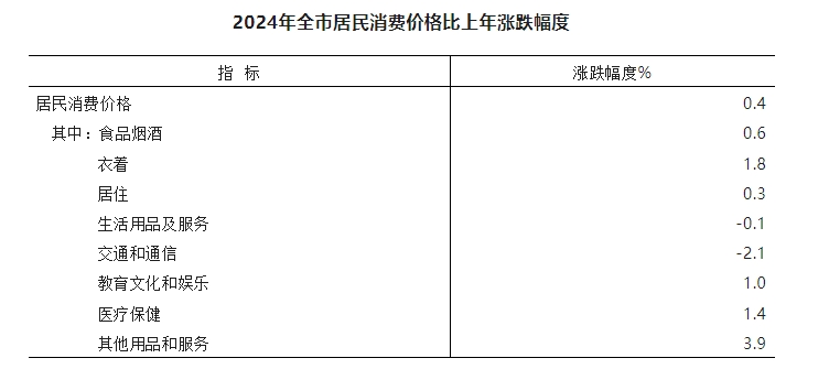 全年居民消费价格比上年上涨0.4%,其中食品烟酒价格上涨0.6%。