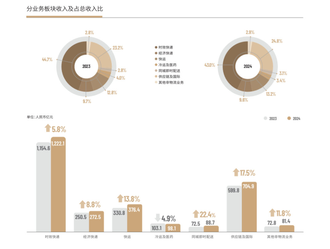 年报显示,顺丰控股的各业务板块在2024年得到了长足发展。得益于在大消费及工业制造业领域的渗透,顺丰的时效快递业务营收1222.1亿元,经济快递业务营收达到272.5亿元;快运业务营业收入达到376.4亿元,同比增长13.8%,货量规模同比增长超过20%;同城即时配送业务实现营业收入88.7亿元,同比增长22.4%;供应链及国际业务收入704.9亿元,同比增长17.5%,有效稳固了公司第二增长曲线。