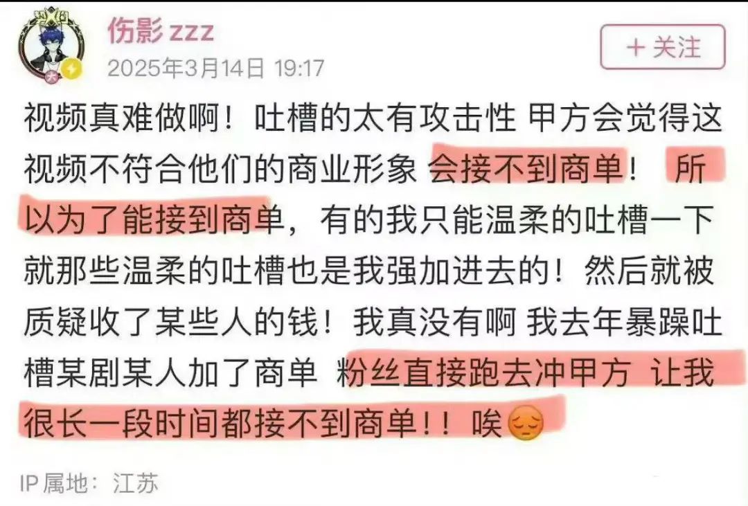 从伤影zzz的表述中,可以看出搞博主商单其实是伤害性非常强的行为。