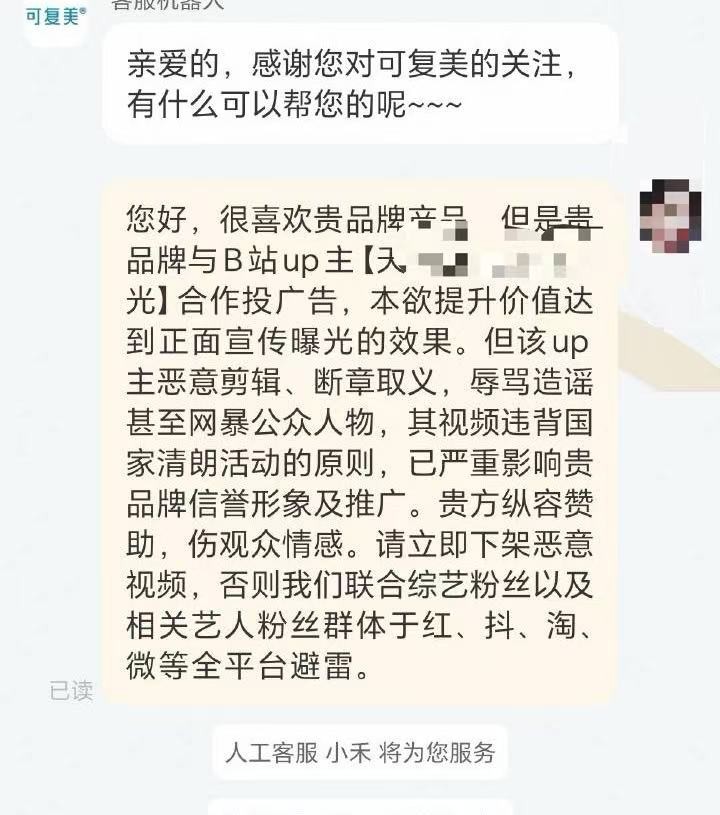 最先站出来的是鹿晗粉圈,大粉号召:“大家重点可以放在宣传博主视频的植入广告的差评、质量功效方面的问题。”粉丝们纷纷涌进各大品牌的客服后台、直播间公屏刷差评,要求品牌方、自媒体下架植入广告的视频链接。