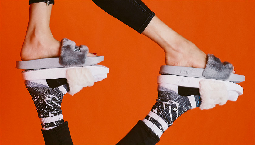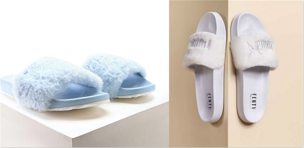 比如最近同样是在美国,Puma把Forever 21告上法庭,原因是后者涉嫌模仿品牌代言人兼创意总监Rihanna的设计。Puma提交的文件中提到Forever 21至少有3款鞋子分别和自家的松糕厚底鞋Fenty PUMA Creeper、蝴蝶结拖鞋Bow Slide以及毛绒拖鞋Fur Slide有惊人相似点,并要求对方立即停售。然而,判决令Puma大失所望,法院驳回其申诉,认为还不到实行限制令的地步。