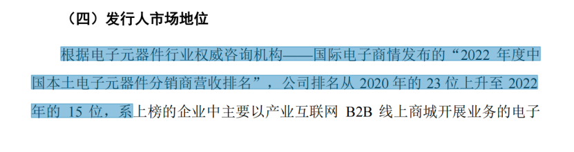 深耕行业多年之后,云汉芯城在市场中已经占有一定地位。招股书显示,根据电子元器件行业权威咨询机构——国际电子商情发布的“2022年度中国本土电子元器件分销商营收排名”,公司从2020年的23位上升至2022年的15位。
