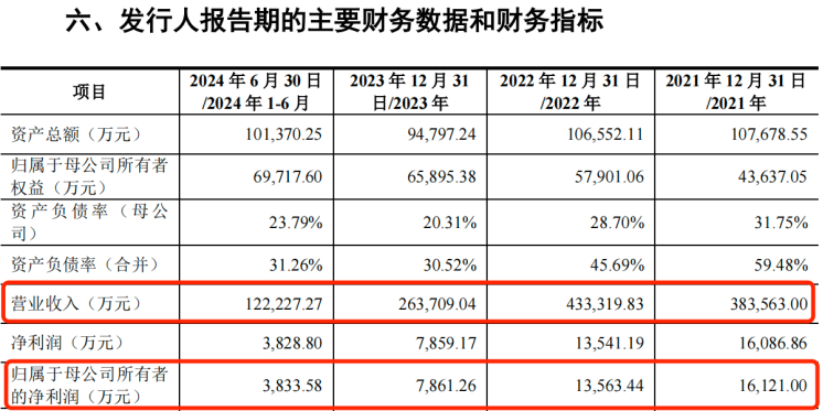 近年来,下游市场需求减弱,云汉芯城的业绩也有所下滑。招股书显示,2021年至2024年上半年(以下简称“报告期”),公司的营业收入分别为38.36亿元、43.33亿元、26.37亿元和12.22亿元;归母净利润分别为1.61亿元、1.36亿元、7861.26万元和3833.58万元。