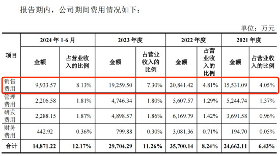 报告期内,公司的销售费用分别为1.55亿元、2.08亿元、1.93亿元和9933.57万元,占当期营业收入的比例分别为4.05%、4.81%、7.30%和8.13%,销售费用率逐年增长。