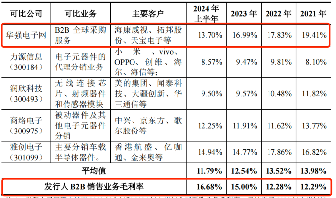 值得注意的是,云汉芯城的毛利率水平并不高。报告期内,公司的B2B销售业务毛利率分别为12.29%、12.28%、15.00%和16.68%,同样致力于线上分销的华强电子网的销售毛利率为19.41%、17.83%、16.99%和13.70%。