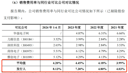 报告期内,云汉芯城的同行可比公司销售费用率平均值分别为3.99%、4.18%、4.45%和4.20%,均低于云汉芯城的销售费用率。