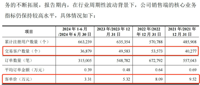 报告期内,云汉芯城的累计注册用户数量分别为48.59万个、57.08万个、63.54万个和66.32万个。在这期间,交易客户数量却只有4.03万个、5.36万个、4.96万个和3.69万个,其中2023年的交易客户数量下降。