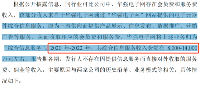 不过,华强电子网还有另外的盈利板块,那就是收取会员费和服务费,这些收入来自电子元器件综合信息服务,即为上游供应商提供产品展示、信息发布、数据推广、营销广告等服务,从而收取相应的会员费和服务费。2020年至2022年,其综合信息服务收入金额在8000万元至1.4亿元左右。