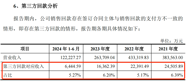 不仅如此,云汉芯城还存在第三方回款的情形。报告期内,公司第三方汇款金额分别为2.45亿元、2.24亿元、1.64亿元和6444.59万元,占当期营业收入比重分别为6.39%、5.17%、6.20%和5.27%。