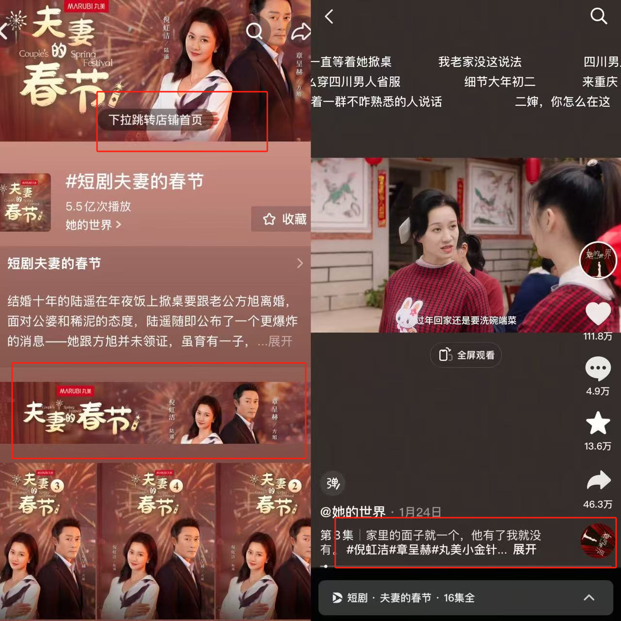 值得注意的是,《夫妻的春节》在剧集界面设置了多个引流入口,帮助品牌进一步将播放量转化为产品销量。例如,用户选择剧集时,可下拉跳转丸美直播间;点击横幅海报,可直接跳转至植入商品购买页;在观看短剧时,点击底部商品话题也可随时跳转至品牌直播间或旗舰店。
